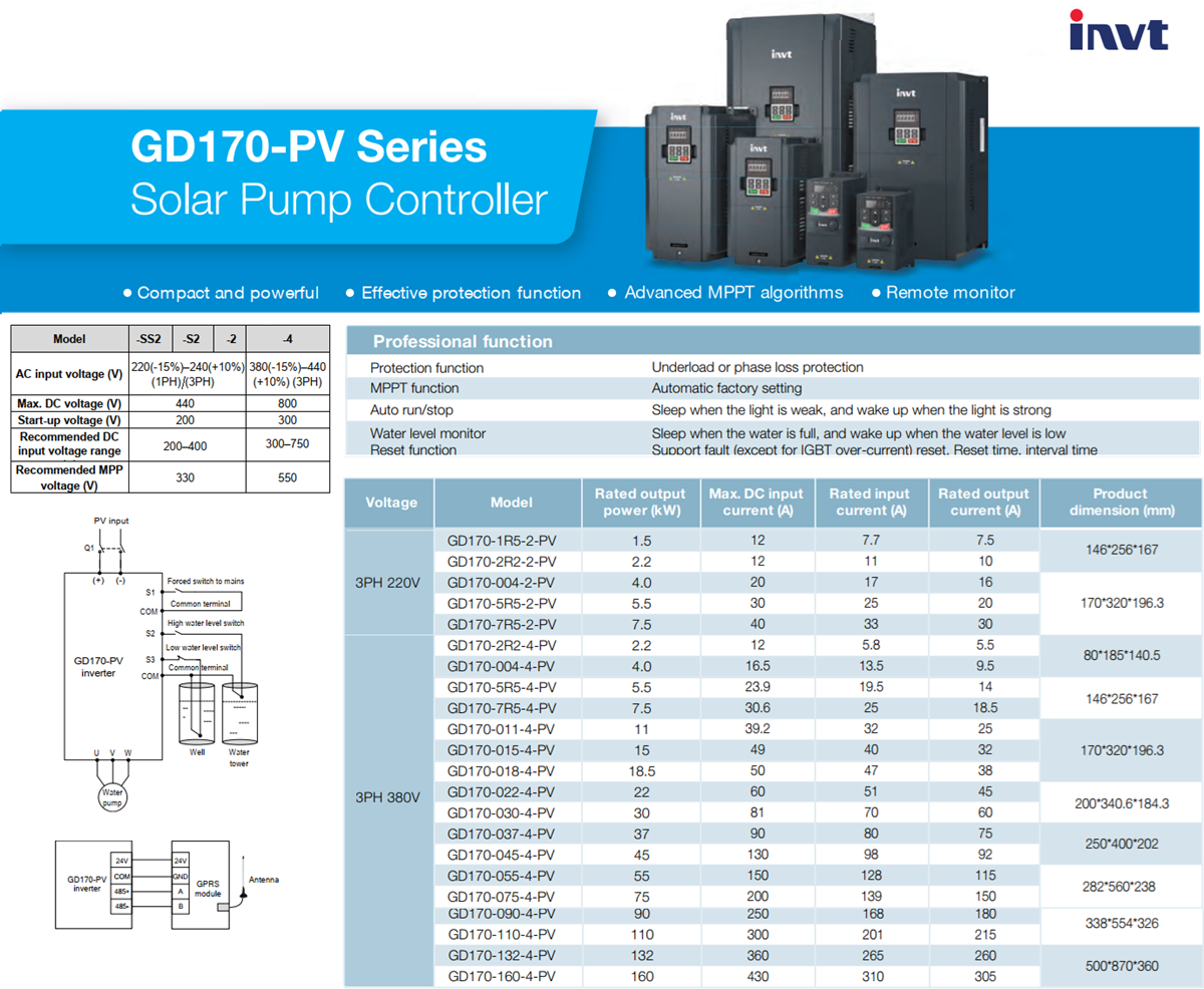 Biến tần bơm nước năng lượng mặt trời GD170-PV Series là dòng sản phẩm mới của nhà sản xuất INVT nhằm thay thế model cũ GD100-PV mà chúng ta đã gặp nhiều trên thị trường.