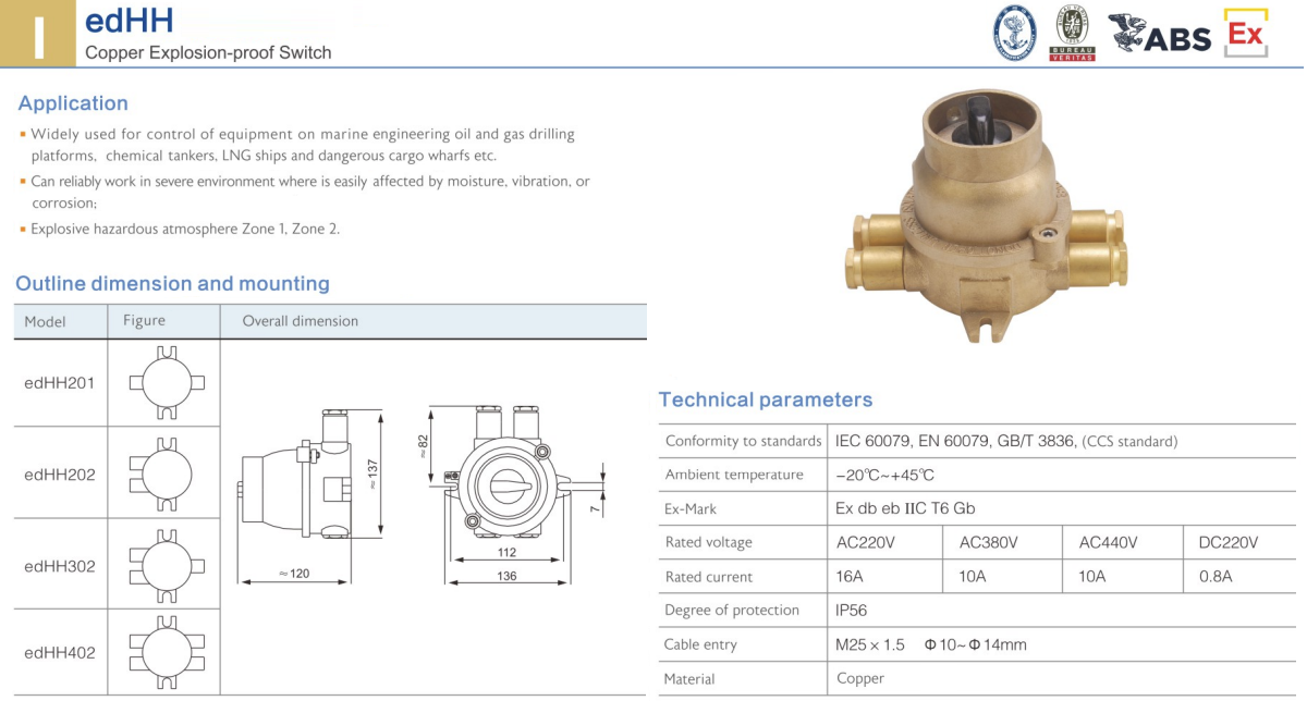 Công tắc chống cháy nổ bằng đồng Warom edHH (edHH Copper Explosion-proof Switch) được sử dụng rộng rãi để điều khiển các thiết bị trên giàn khoan dầu khí kỹ thuật hàng hải, tàu chở hóa chất, tàu LNG và cầu cảng chở hàng nguy hiểm, v.v.; Có thể làm việc đáng tin cậy trong môi trường khắc nghiệt dễ bị ảnh hưởng bởi độ ẩm, rung động hoặc ăn mòn; Môi trường nguy hiểm cháy nổ Vùng 1, Vùng 2.