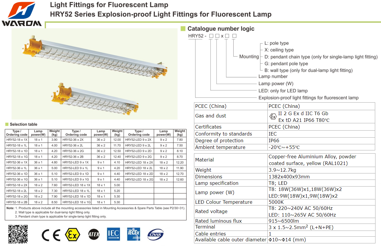 Đèn Huỳnh Quang chống cháy nổ của hãng Warom thường được dùng những khu vực như: kho chứa gas, dung môi, hóa chất, sản xuất sơn, chiết rót dầu khí là nơi có nguy cơ cháy nổ cao. Đèn Huỳnh Quang chống cháy nổ HRY52 Series có các dòng đèn đôi 9W, 18w và 38w. Độ kín của thiết bị này vào khoảng IP66 và IP67 mở rộng.