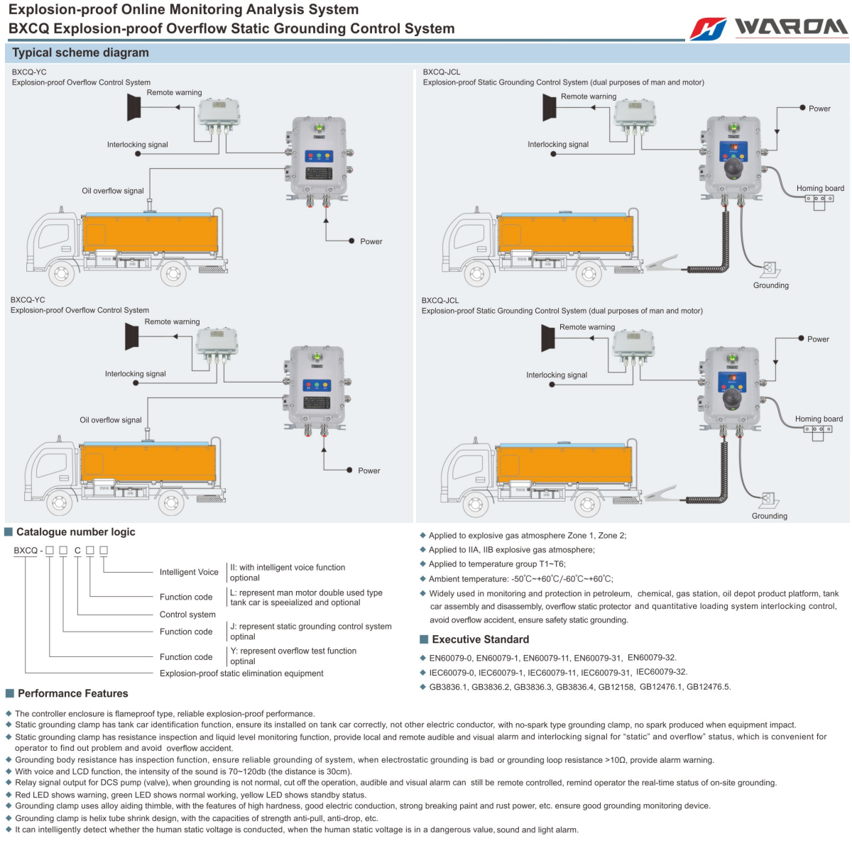 Hệ thống kiểm soát nối đất tĩnh chống tràn chống cháy nổ Warom BXCQ( BXCQ Explosion-proof Overflow Static Grounding Control Syste) thường được sử dụng rộng rãi trong giám sát và bảo vệ trong nền tảng sản phẩm dầu khí, hóa chất, trạm xăng, kho chứa dầu, lắp ráp và tháo rời xe bồn, thiết bị bảo vệ tĩnh tràn và hệ thống nạp định lượng kiểm soát liên động, tránh tai nạn tràn, đảm bảo nối đất tĩnh an toàn. Áp dụng cho khí nổ Vùng 1 & 2; Áp dụng cho môi trường khí nổ IIA, IIB; Áp dụng cho nhóm nhiệt độ T1 ~ T6; Nhiệt độ môi trường: -50 ℃ ~ + 60 ℃ / -60 ℃ ~ + 60 ℃; Tiêu chuẩn Điều hành: EN; IEC, GB.