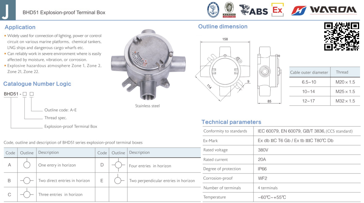 Hộp đầu cuối chống cháy nổ BHD51 (BHD51 Explosion-proof Terminal Box) được sử dụng rộng rãi để kết nối hệ thống chiếu sáng, nguồn điện hoặc mạch điều khiển trên các nền tảng hàng hải khác nhau, tàu chở hóa chất, tàu LNG và cầu cảng chở hàng nguy hiểm, v.v.; Có thể làm việc đáng tin cậy trong môi trường khắc nghiệt dễ bị ảnh hưởng bởi độ ẩm, rung động hoặc ăn mòn; Môi trường nguy hiểm cháy nổ Vùng 1, Vùng 2, Vùng 21, Vùng 22. Hộp đấu nối chống nổ thường có dòng điện 20A. Độ kín của thiết bị này vào khoảng IP66. Với các Model: BHD51-M20, BHD51-M25, BHD51-M32,...
