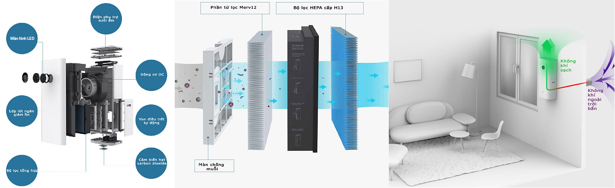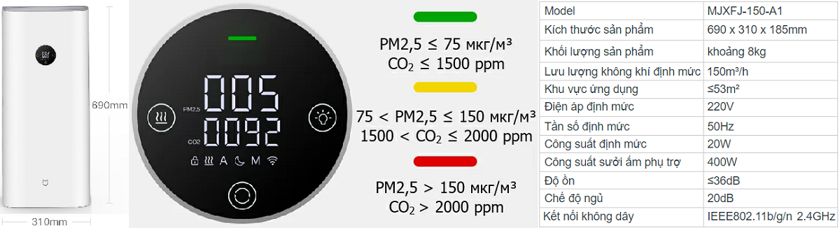Máy cấp gió tươi gắn tường Mijia A1(MIJIA A1 Fresh Air Blower) MJXFJ-150-A1 là thiết bị cần thiết để bảo vệ sức khỏe cho mọi người trong gia đình và công ty xí nghiệp. Máy có thiết kế nhỏ gọn nhưng đầy đủ các tính năng cơ bản của một máy lọc không khí thông minh, nó phù hợp cho căn hộ vừa với lọc đối lưu không khí trong nhà và loại bỏ các chất độc hại bên ngoài môi trường giúp cải thiện không khí bên trong nhà. Thiết kế đạt độ thẩm mỹ cao phù hợp với hầu hết các thiết kế nội thất thông dụng hiện nay. Máy lọc không khí cấp gió tươi MJXFJ-150-A1 nhỏ gọn linh hoạt thường áp dụng cho phòng có diện tích sử dụng phù hợp là <55m2, Lưu lượng chuyển đổi không khí tươi là 150m3/h. Máy có nhiều bộ lọc không khí vì vậy áp suất trong phòng trở nên cao hơn để tạo thành áp suất dương nhẹ, sự lưu thông không khí liên tục làm loãng nồng độ formaldehyde trong nhà, PM2.5, Carbon dioxide và các khí độc khác. Máy dễ dàng kết nối điều khiển thông minh và giám sát tình trạng hoạt động của máy, bộ lọc, chất lượng không khí thông qua điện thoại thông minh hay máy tính bảng,...