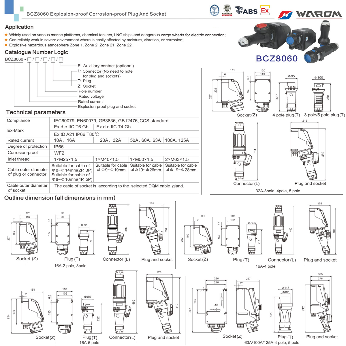 Phích cắm và Ổ cắm chống cháy nổ Warom thường được dùng những khu vực như: kho chứa gas, dung môi, hóa chất, sản xuất sơn, chiết rót dầu khí là nơi có nguy cơ cháy nổ cao. Ổ cắm và phích cắm chống nổ BCZ8060 (BCZ8060 Explosion-proof Corrosion-proof Plug And Socket) thường có dòng điện 10A-16A-20A-32A-50A-60A-63A-100A-125A. Độ kín của thiết bị này vào khoảng IP66, IP67(tùy chọn). Với các Model: BCZ8060-10, BCZ8060-16, BCZ8060-20, BCZ8060-32, BCZ8060-50, BCZ8060-60, BCZ8060-63, BCZ8060-100, BCZ8060-125,...